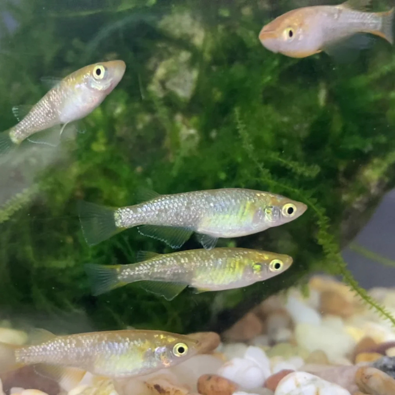 The Medaka Sparkling Ricefish (Oryzias latipes) is a small, peaceful species native to East Asia, where it’s long been admired for its adaptability and beauty. With slender bodies that glint silver, gold, or even blue under light, they resemble swimming jewels that enliven any aquatic environment.