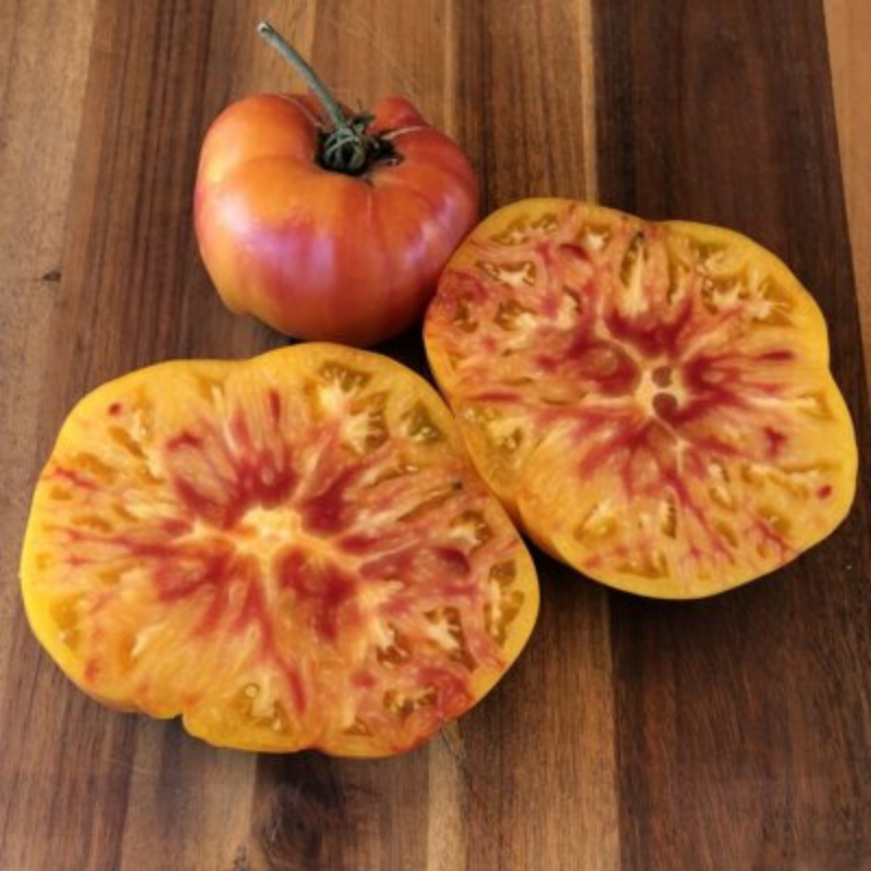Few tomatoes live up to their name as brilliantly as the Gold Medal Tomato. This stunning heirloom is a true showstopper, producing massive, golden-yellow fruits beautifully marbled with red. Slice into one, and you’ll find a juicy interior streaked with ribbons of scarlet, each bite delivering a rich, sweet flavor balanced with just the right touch of tang. It’s no wonder this variety is often called the “gold standard” of bicolor heirlooms.