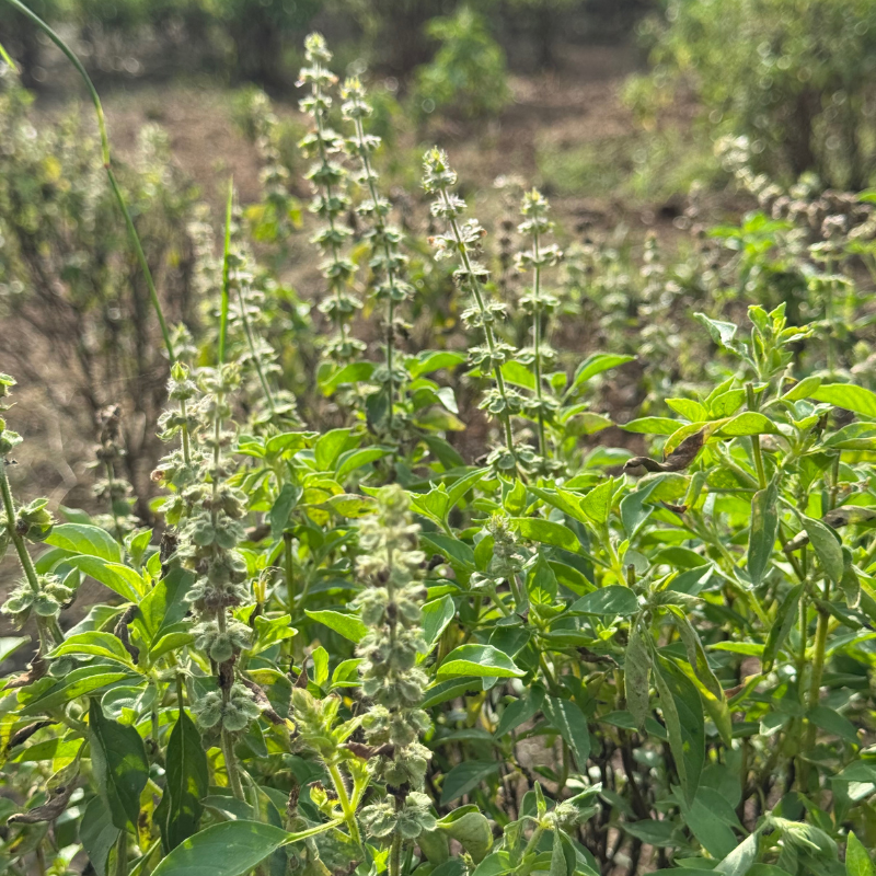 Holy Basil, Ocimum tenuiflorum, is a sacred herb in Ayurvedic tradition and widely cultivated throughout India and Southeast Asia. Unlike culinary sweet basil, Tulsi grows taller and more open, with branching stems, slightly fuzzy leaves, and delicate purple-tinged flower spikes that bees cannot resist.