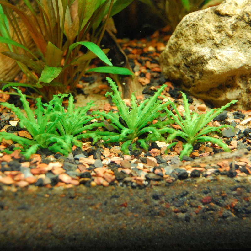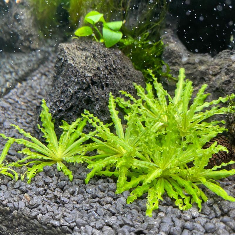 Downoi’s signature curled, star-shaped leaves form lush clusters that resemble miniature green flowers or underwater bonsai foliage. When planted in groups, it creates a dense, rippling carpet effect that beautifully complements red or tall background plants. Its compact form and vivid green hue provide a stunning color contrast against darker substrates and driftwood, drawing the eye and creating a natural sense of movement.