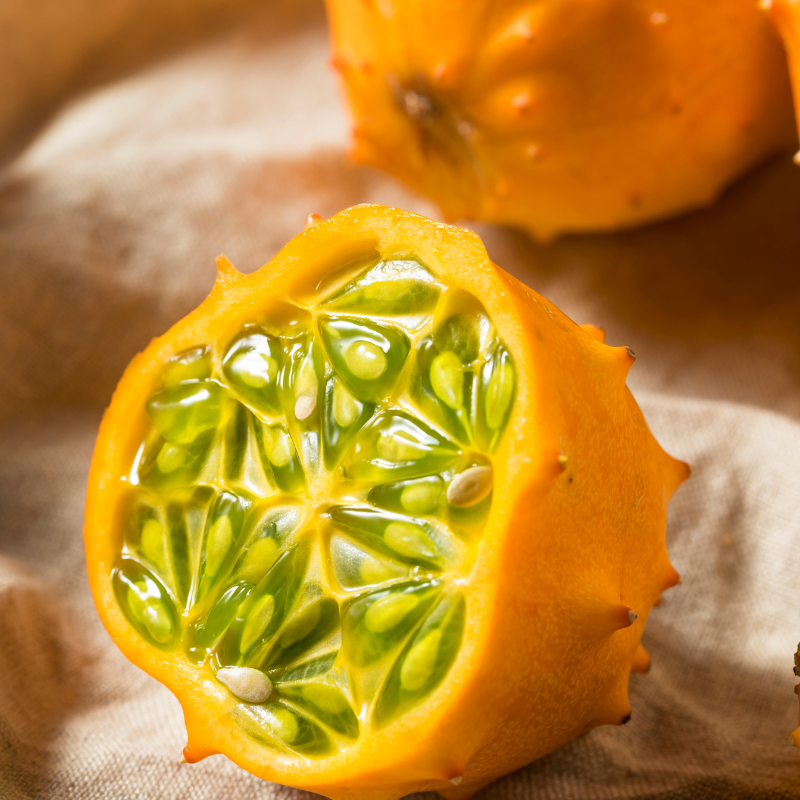 Kiwano Jelly Melon Seeds (Cucumis metuliferus) Exotic horned melon producing vibrant orange fruit with lime-green jelly flesh; drought-tolerant vine ideal for trellises and adventurous gardens