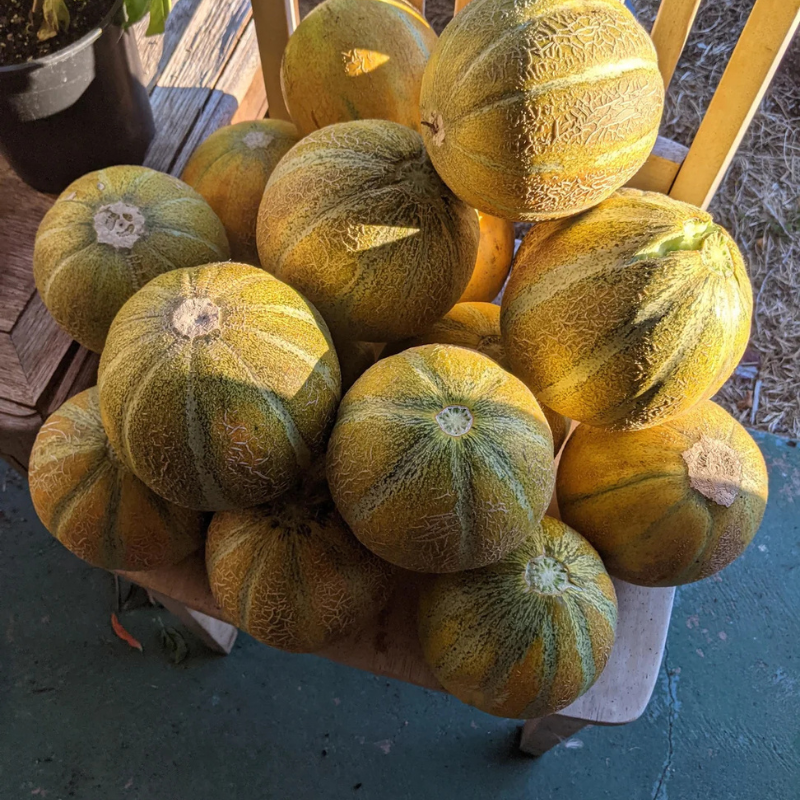 Reduce watering slightly as fruit matures to concentrate sweetness. Harvest when the melon slips easily from the vine and the fragrance is strong and unmistakable.