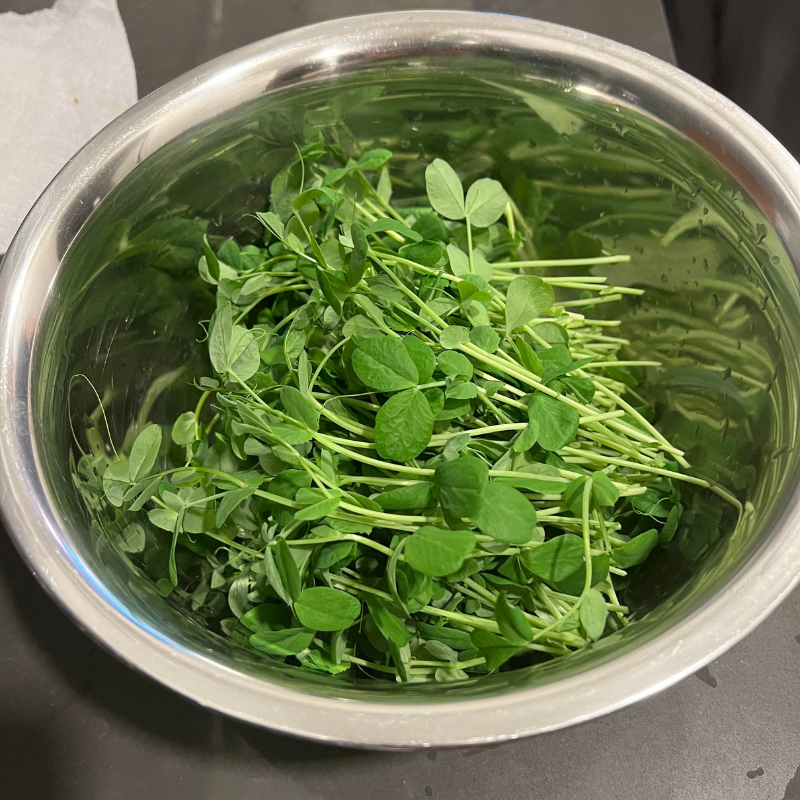 Pea microgreens are harvested at a stage when plants are packed with concentrated nutrients.
