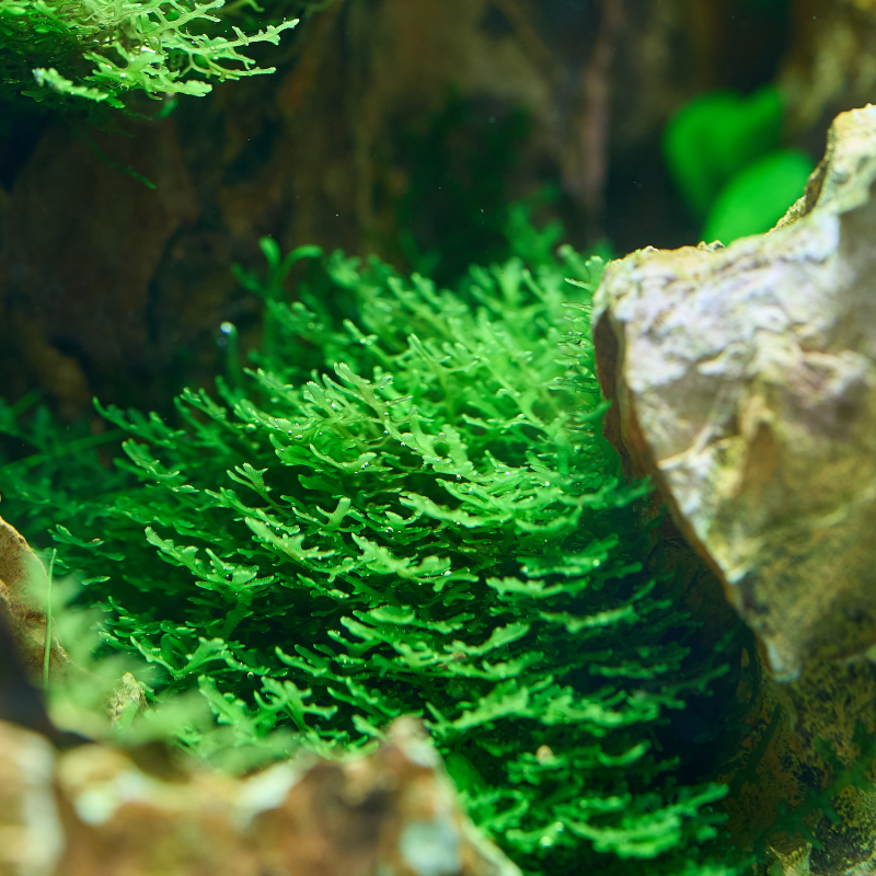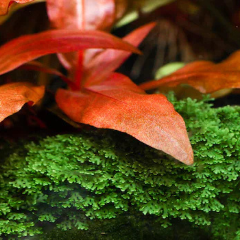 This moss is a top choice for shrimp breeders. Its tight, lacy structure offers ideal surfaces for shrimp to graze on biofilm and find shelter for breeding. Baby shrimp love hiding within its fronds, where they can feed safely. Its slow growth and low nutrient demands make it an excellent low-bioload plant for small or delicately balanced tanks.
