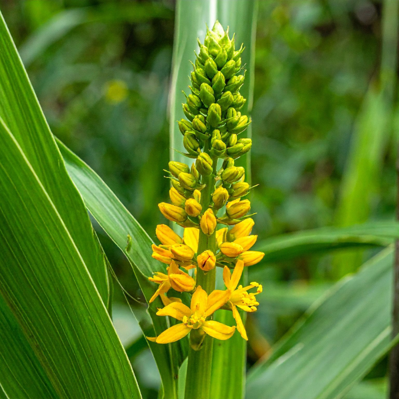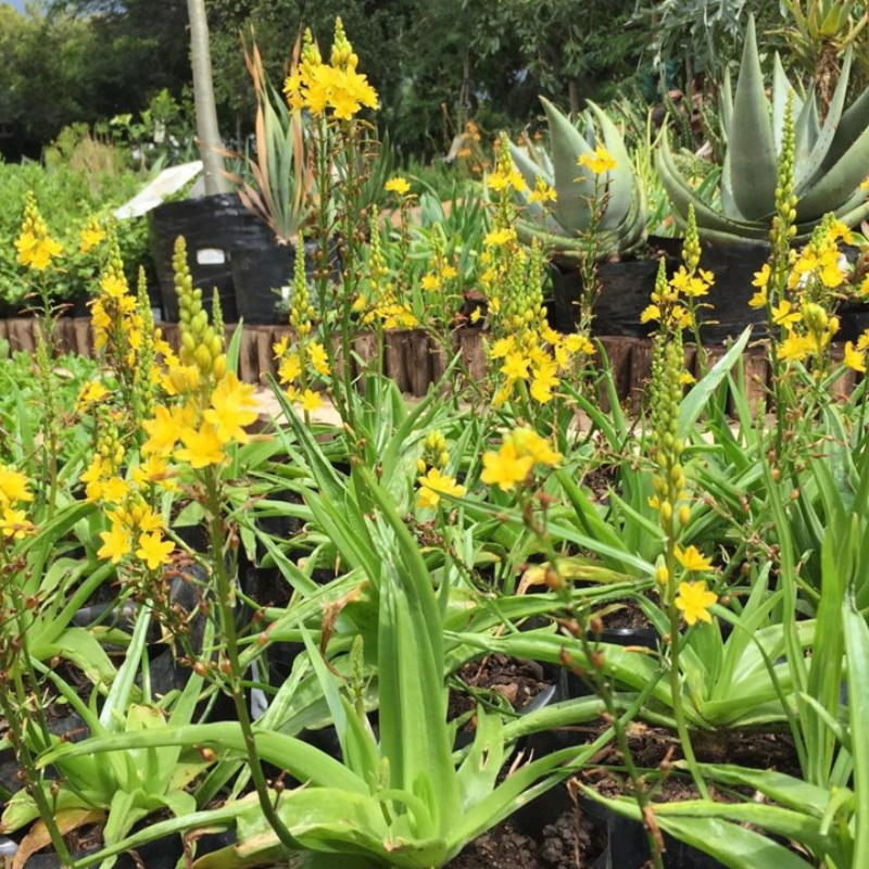 Native to the rocky grasslands of South Africa, Bulbine natalensis thrives in sunny, dry regions where few plants survive. Its succulent, aloe-like leaves store moisture, allowing it to endure drought and heat while maintaining lush green growth. During the warm months, tall flower stalks rise above the foliage, showcasing clusters of brilliant yellow, star-shaped blooms that attract bees and butterflies.