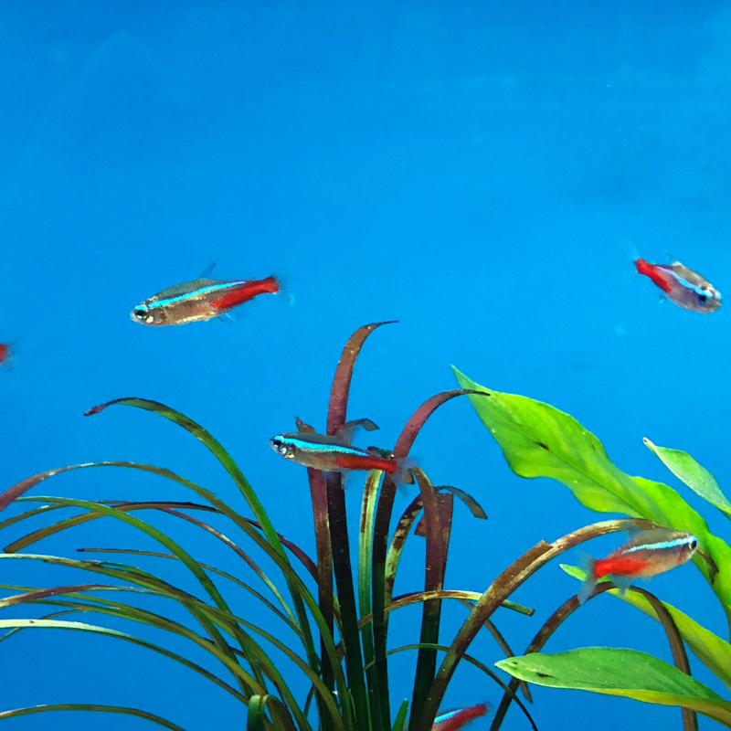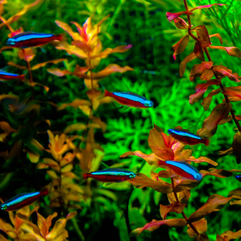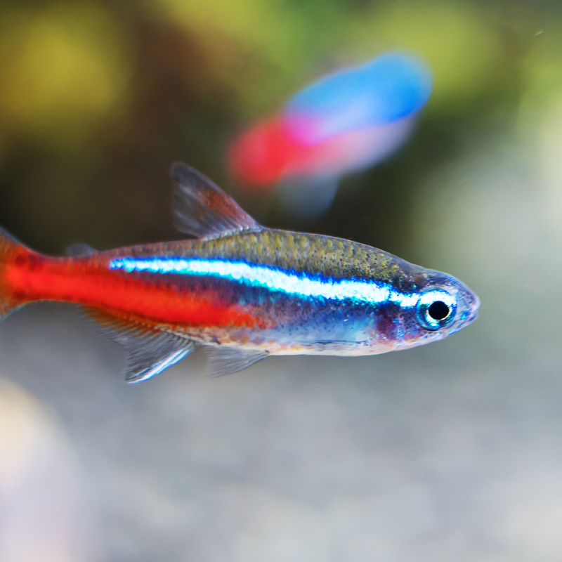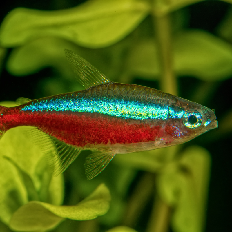 Neon Tetra Fish (Paracheirodon innesi) – Iconic freshwater favorite with glowing blue and red stripes. Peaceful, active, and perfect for any community aquarium.