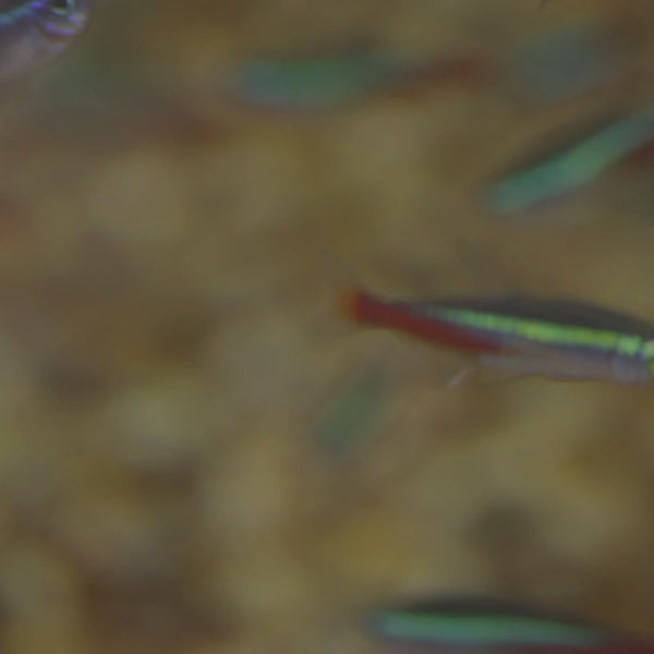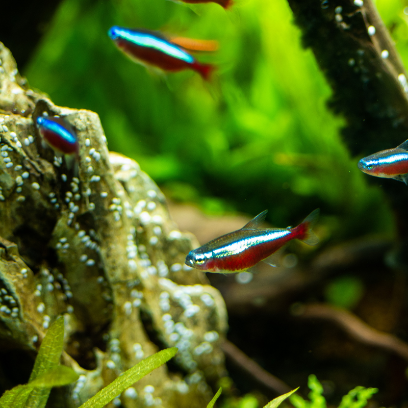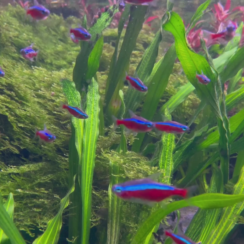 Neon Tetras are energetic, playful swimmers that remain active throughout the tank, constantly exploring and interacting with their environment. Their lively movements encourage natural tank dynamics and pair beautifully with plants, driftwood, and midwater-dwelling species.