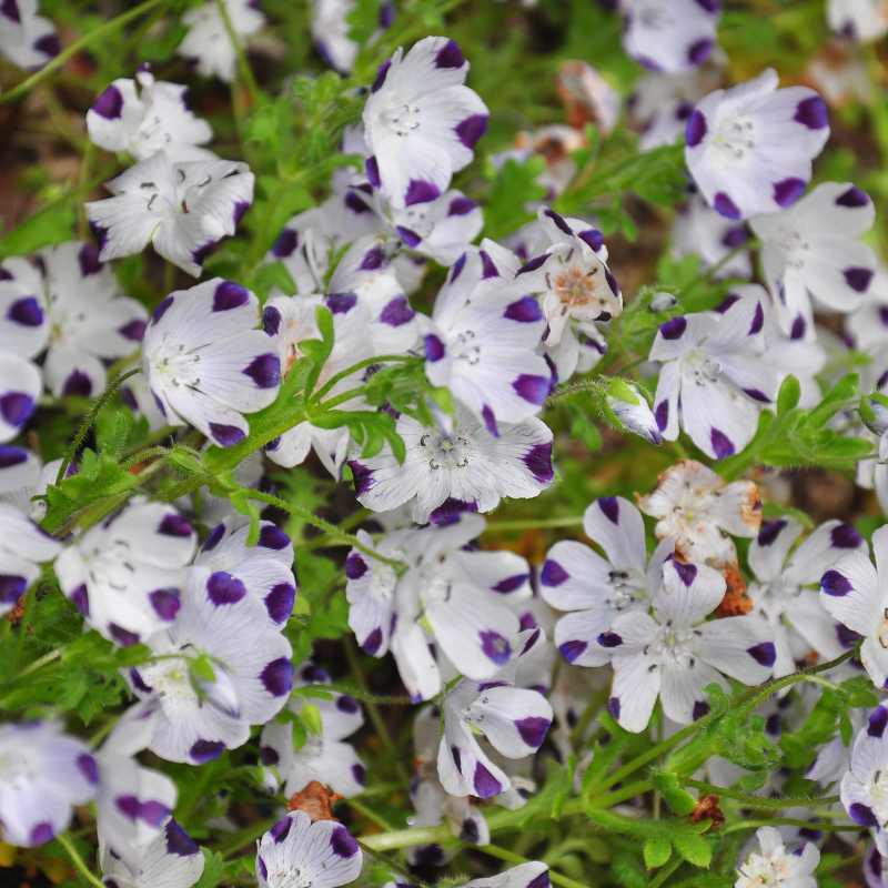 Five-Spot (Nemophila maculata) – White petals tipped with striking purple “spots,” stunning in mass plantings.