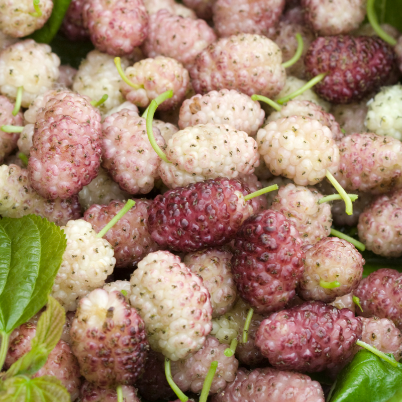 White mulberries produce small, elongated berries that range from ivory to light purple. Their sweet, honey-like flavor makes them perfect for fresh snacking, desserts, smoothies, and jams. Dried mulberries are a natural superfood, high in vitamin C, iron, calcium, fiber, and antioxidants.